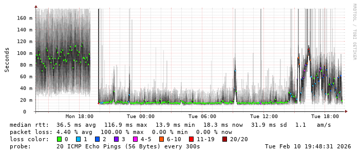 Now, on a more interesting note, SmokePing was nice & clean for awhile but this evening it got a little bumpy: