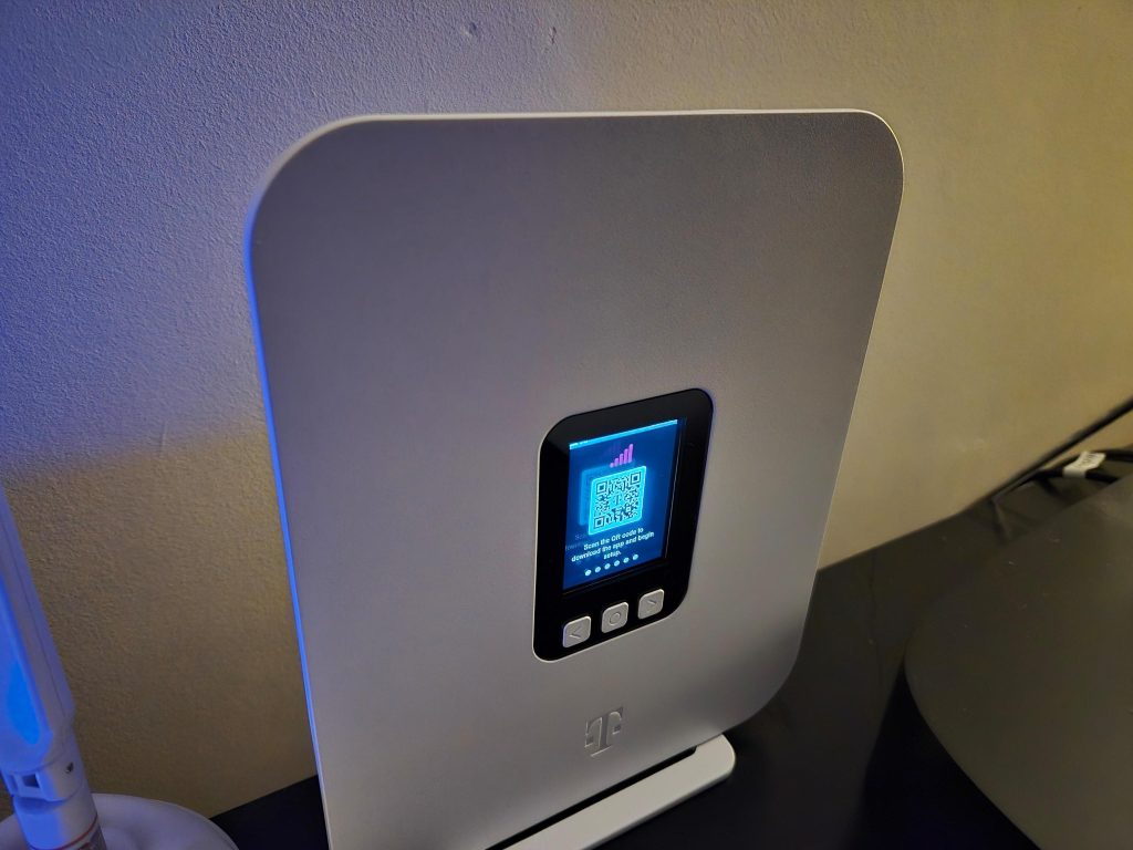 The T-Mobile backup Internet plan for $20/mo comes with 130GiB 5G data per month and “3G speeds” thereafter. That’s just fine since my Fios hardly ever goes out but it gives me peace of mind. The cellular router itself has 2x GigE ports and Wi-Fi and is built by a company called Arcadyan (model code G5AR). It’s got a little display that show signal strength and a QR code to download the T-Mobile app, which seems utterly useless: