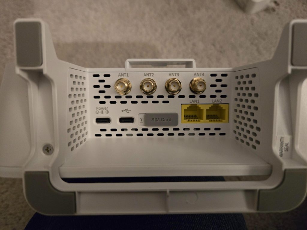 It’s powered by USB-C (I just used the included power adapter), has a USB-C data port (CDC ACM, not Ethernet over USB), and has 2x LAN ports and 4x external antenna connectors. Luckily my townhome is 4 floors and I have this thing on the top floor, so I have no signal strength issues. RSSI is at -72 dBm and it’s using band n41, which is 2,496 to 2,690 MHz.